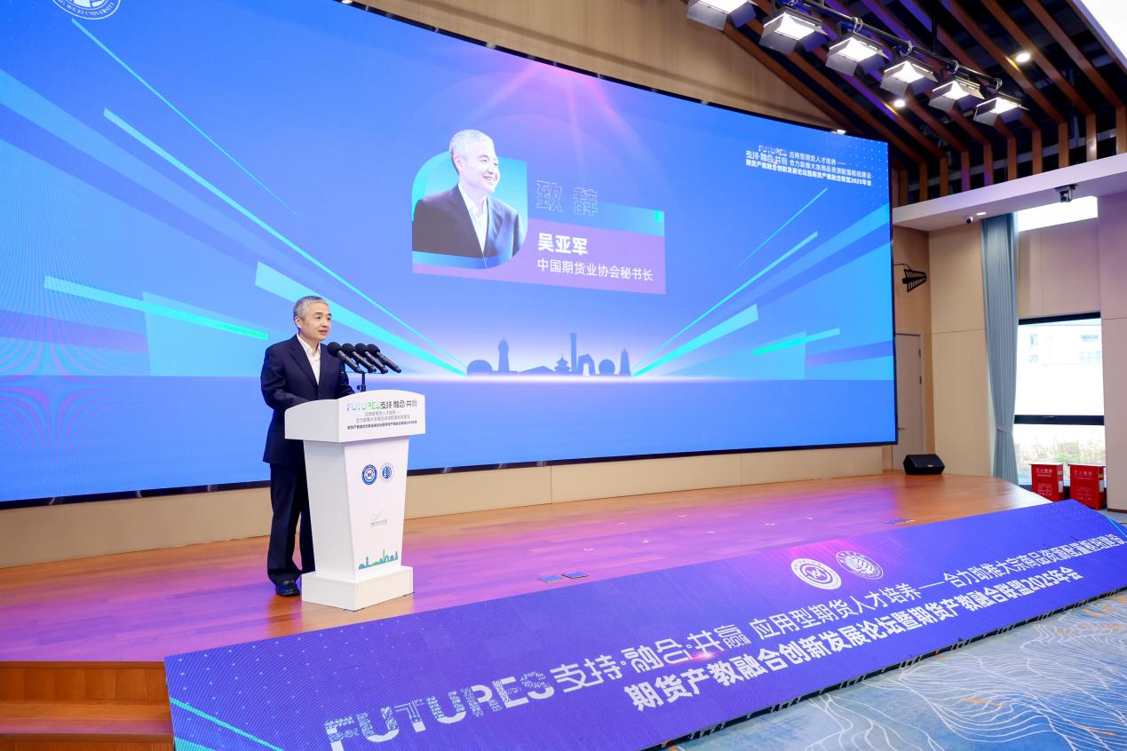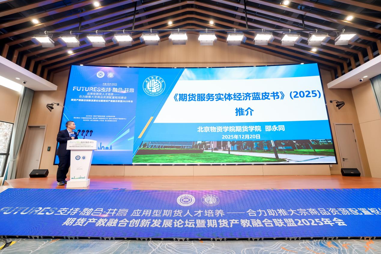 2025年12月20日,期货产教融合创新发展论坛暨期货产教融合联盟2025年会在杭州玉皇山南基金小镇路演中心召开。本次大会主题为“支持·融合·共赢:应用型期货人才培养——合力助推大宗商品资源配置枢纽建设”,会议由期货产教融合联盟与北京物资学院联合主办,中国期货研究院、敦和资产管理有限公司、亚科大宗商品产融集聚中心承办,浙江省金融人才协会、浙江省期货业协会协办。来自中国期货业协会、期货交易所、期货公司、大宗商品现货企业、兄弟高校及联盟理事单位等180余名代表参会。中国期货业协会秘书长吴亚军,杭州市上城区委常委、统战部部长、区金融产业发展委员会常务副主任陈健,北京物资学院党委副书记、院长左敏出席会议并致辞。会议由北京物资学院副院长张旭凤主持。