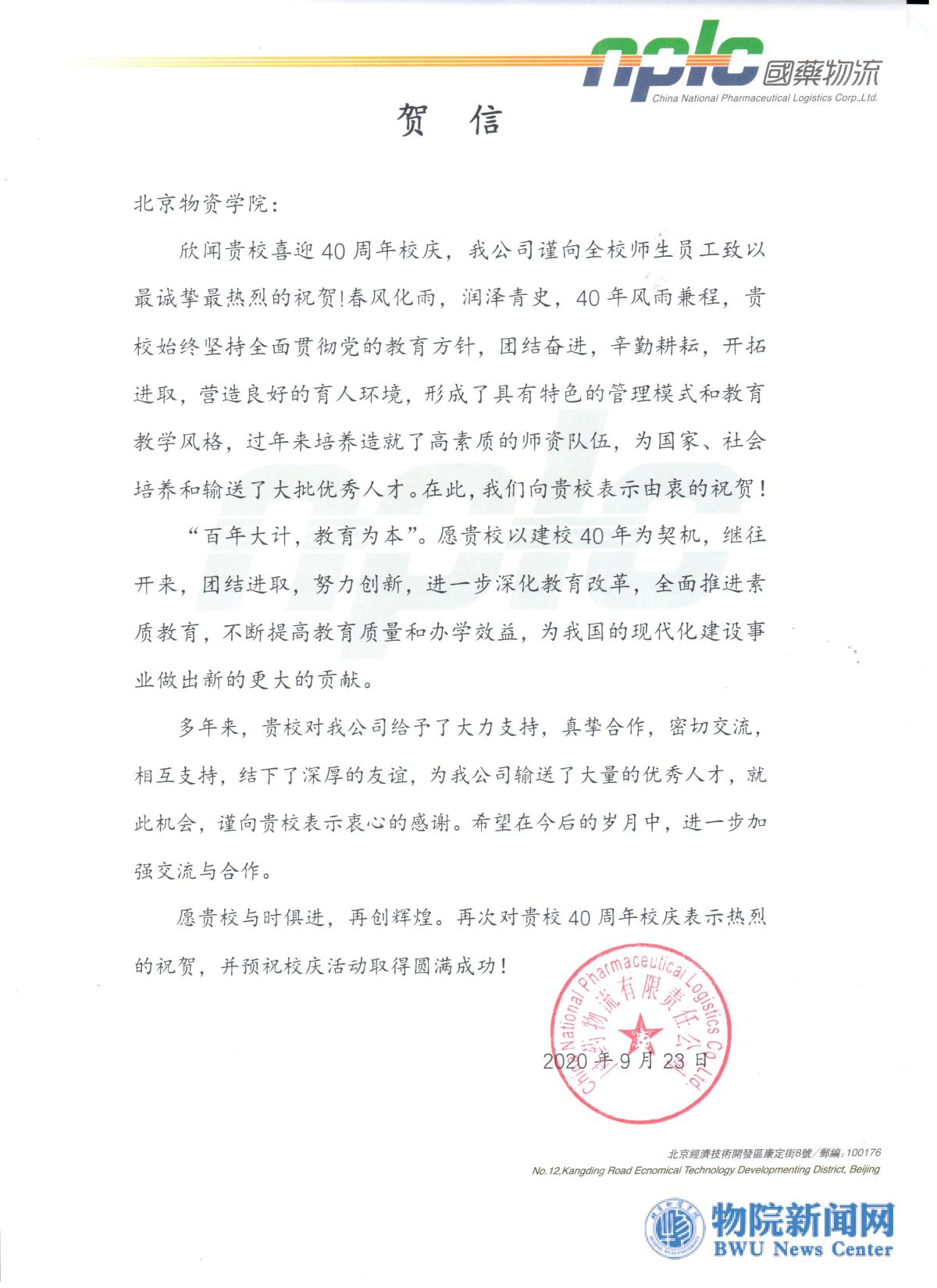 国药物流有限责任公司贺信