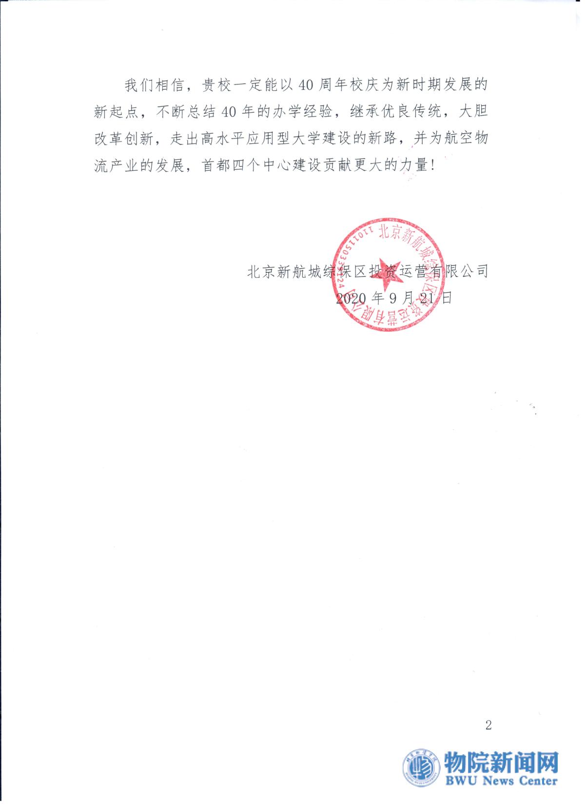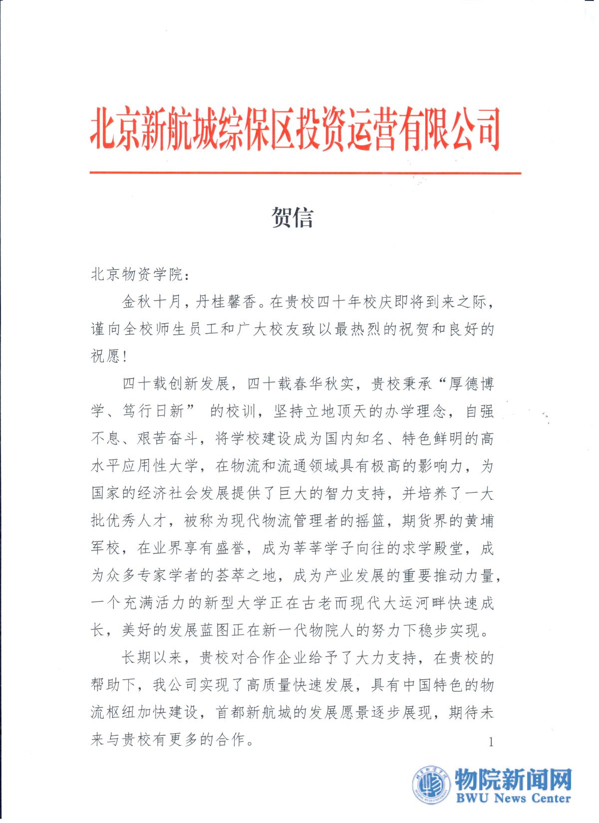 北京新航城综保区投资运营有限公司贺信