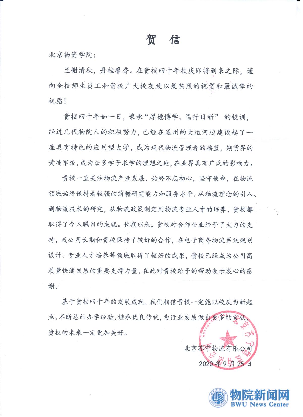 北京苏宁物流有限公司贺信